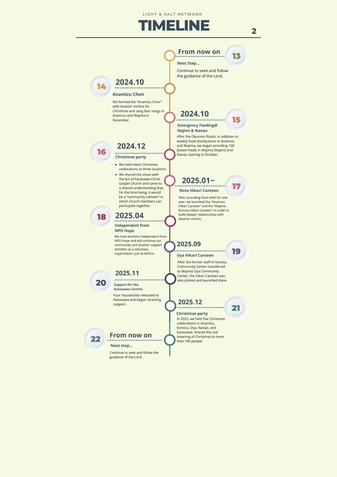 光塩ネットワークは、地域貢献活動を2023年9月に活動が開始しました。 2024年元旦の能登地震私たちは、地域の人々に手を差し伸べながら、コミュニティーのニーズにお応えし、愛情を分かち合い絆をつなげるための団体です。